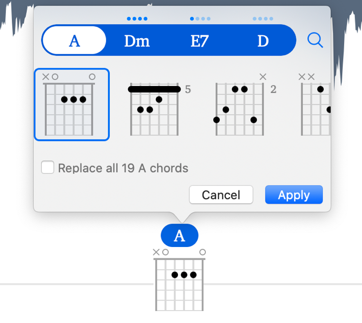In the case where Capo was repeatedly wrong about a specific chord—maybe it detected a "C minor" instead of "C major" across the whole song—you can change all these chords at once by toggling the Replace all… option that appears at the bottom of the Chord Chooser.