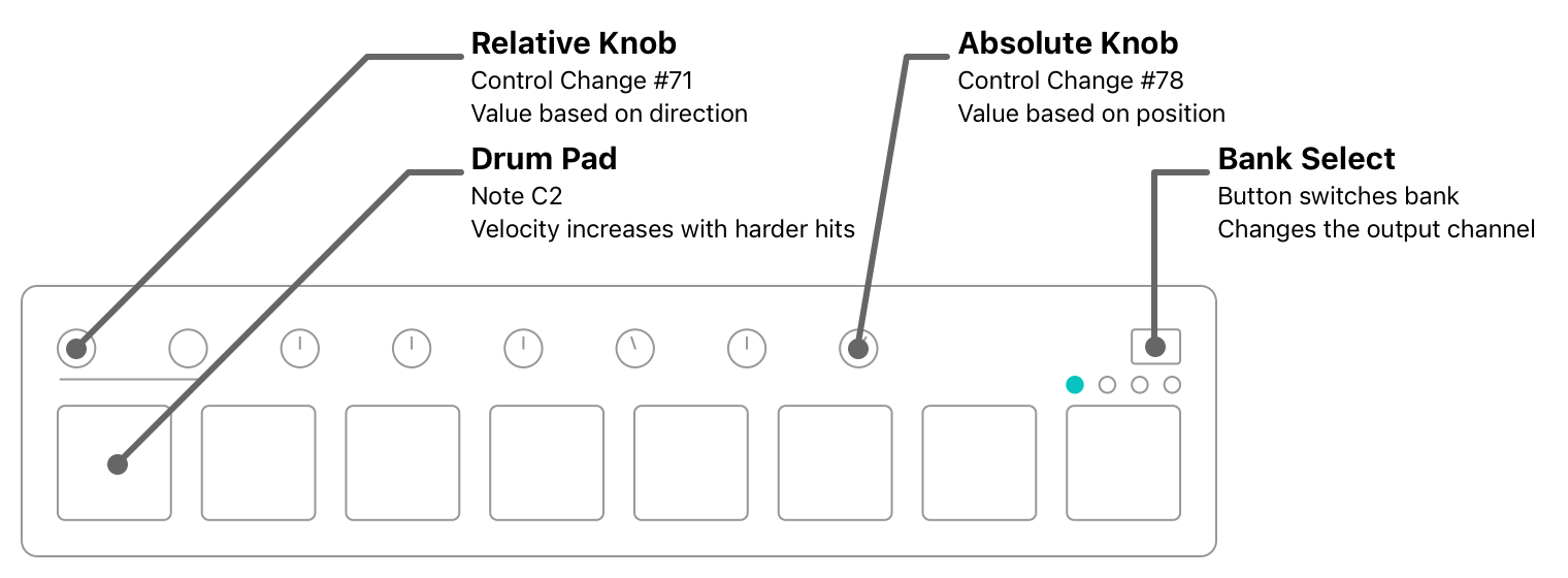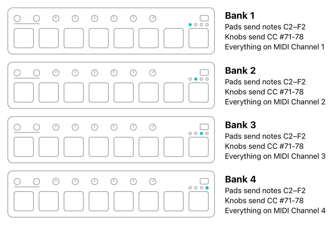 In the factory configuration, each of the eight pads sends a NoteOn or NoteOff message in the same note range of C2-F2. The knobs all send control change messages from #71-78. When the bank is switched, the control surface sends the same messages, only on a different MIDI channel.