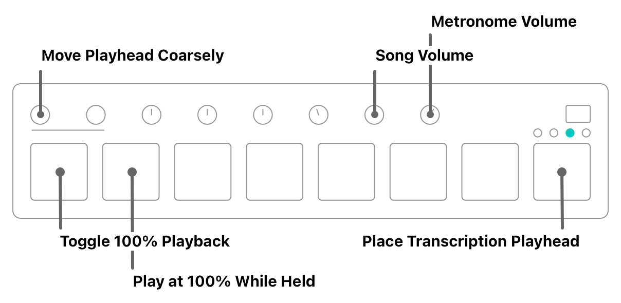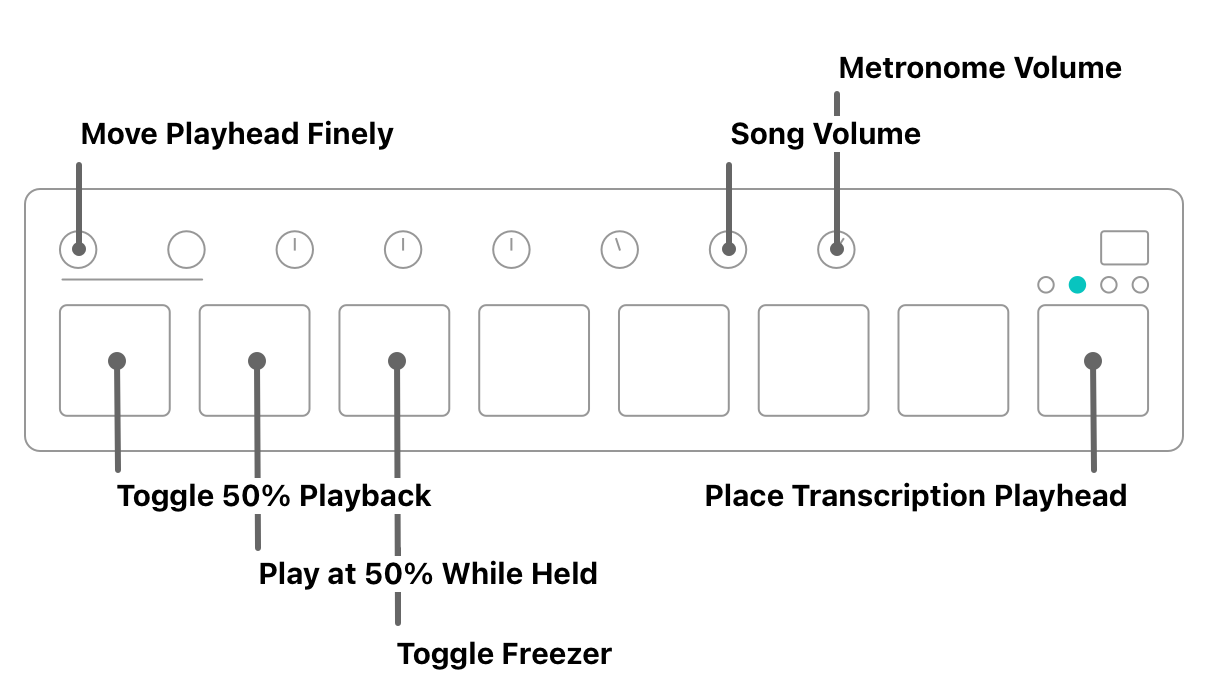 In the second bank, we'll group together our "slow playback" controls to help us learn tricky solos in bite-sized chunks. When we're working in this mode, we're going to use the audio freezer along with the first relative knob to give us access to Capo's scrubbing functionality.