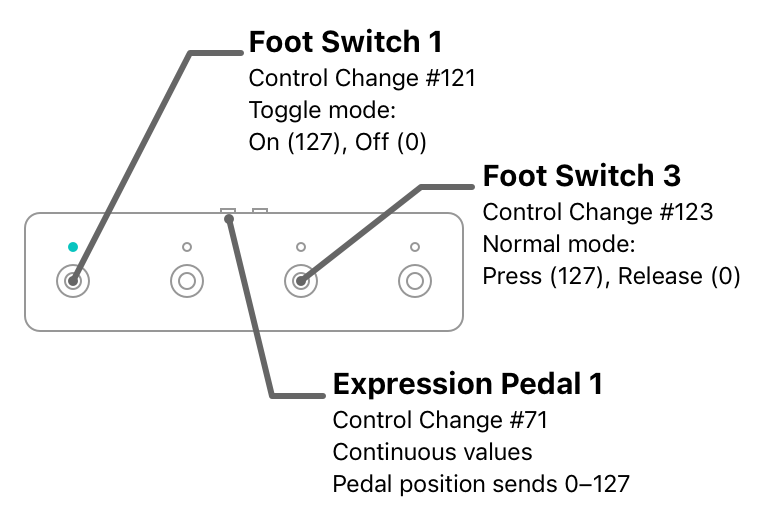 From the factory, this pedal is configured with two different foot switch behaviours. The first two are toggle switches, where pressing and releasing the switch will either turn it ON, or OFF–the state of the switch will remain the same after it is released, with a light that reflects the current state. The second two are normal switches that are in the ON state only while they are held down; they switch OFF once they are released. Regardless of the switch behaviour, the ON state sends a control change message with a value of 127, and the OFF state sends a control change message with a value of 0.