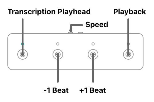Here, we want the first switch to control the state of the transcription playhead; if the light is on, then the transcription playhead is active. The middle two switches will move the playhead backwards or forwards, one beat at a time. The fourth switch is meant to help us learn the solo in small, bite-sized chunks: while this switch is held down, Capo should play audio; releasing the switch should stop playback. Finally, the expression pedal will control the speed of playback: when all the way down, the song plays at full speed; at the top, it slows to 25%; other positions select the speeds in between.