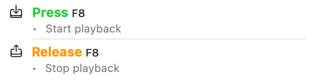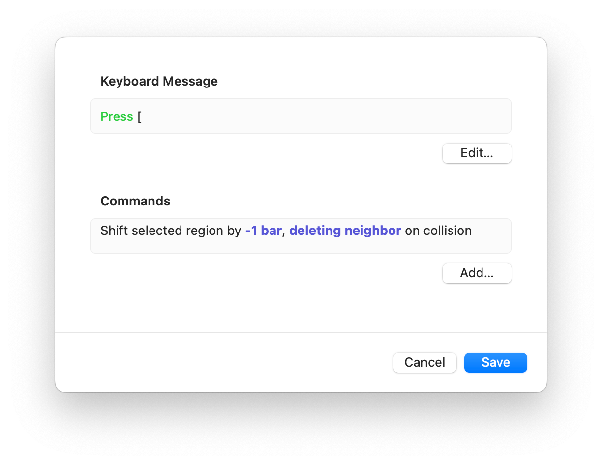 A keyboard message represents either a press (keyDown) or release (keyUp) of a keystroke on your keyboard. Keystrokes can be specified with modifier keys (e.g., control, shift, option), but they are not mandatory–"bare" keys like the numbers 0-9, or [ and ] are easier to operate quickly with one hand. By specifying separate press and release messages, you can create bindings that trigger operations only while the key is held down. For example, you could specify that pressing the F8 key starts playback, and releasing the key stops it.