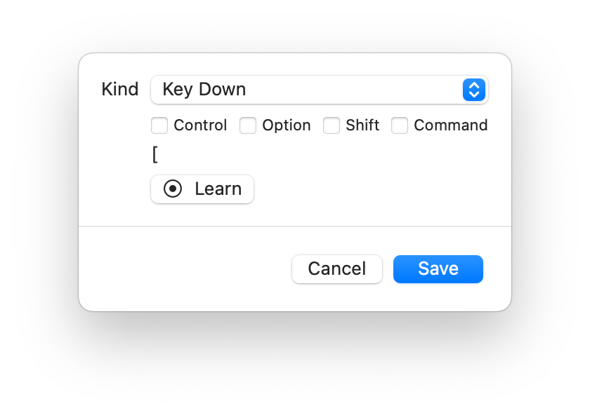 The Keyboard Message Editor appears when you set the message that triggers a keyboard binding, or when you edit an existing one. You can configure some aspects of the message manually by choosing its Kind (Key Down or Key Up) and selecting the modifier keys that must be pressed. However, unlike the MIDI Message Editor, learning is mandatory to configure a keyboard message.