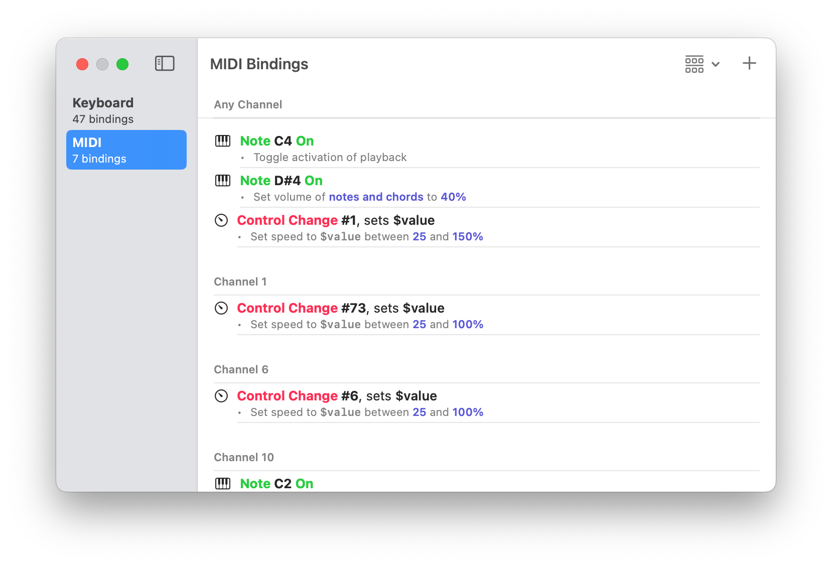 MIDI bindings always appear in sorted order, but you might want to rearrange the listing so that bindings are grouped together by channel, by message type (e.g., Note On, Control Change), or with no grouping.