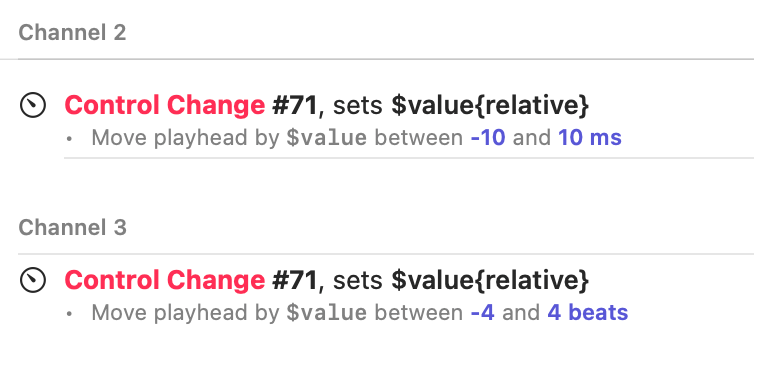In this list we see the expression pedal (CC #71) followed by the four switches (CC #121-124). The expression pedal is rather straightforward: it is a variable binding that translates values from the pedal (0-127) into a speed of 25-100%.