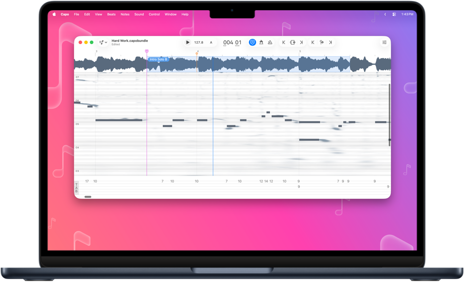 We moved all of Capo's controls from the Control Strip to a standard toolbar that looks and feels very familiar on the Mac. If you right-click on the toolbar, you can now customize the layout to rearrange controls however you want. Each song view has its own toolbar layout, so you can tailor your selections to fit how you work with Capo.